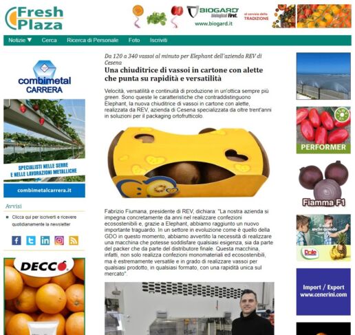 Il notiziario internazionale dedicato al mondo dell’ortofrutta racconta la nostra chiuditrice di vassoi e bauletti in cartone con alette laterali, la più veloce sul mercato, in grado di realizzare confezioni monomateriale (in cartone teso oppure ondulato, di tipo wrap o flat), totalmente riciclabili e adatte ad una gamma di prodotti estremamente ampia. Scopri tutto su Elephant: https://www.revsrl.com/portfolio/elephant-chiuditrice-di-vassoi-in-cartone-con-alette/.